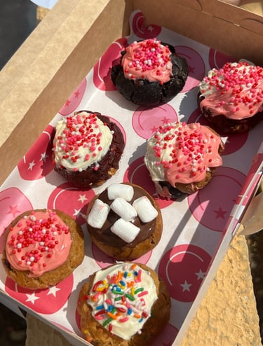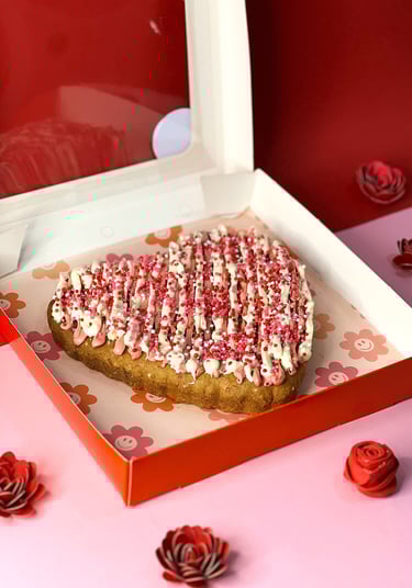 550gr Galleta de vainilla rellena de gotas de chocolate blanco y chispas de colores San Valentín cubierto de crema de fresa y crema de chocolate blanco con chispas de colores San Valentín