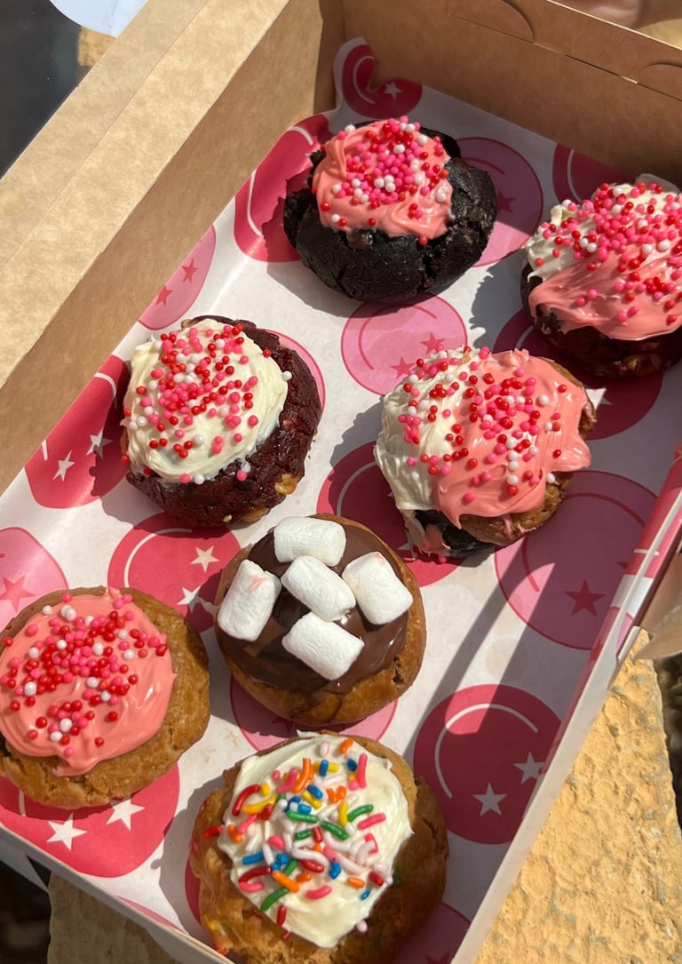 Masa de vainilla rellena de gotas de chocolate blanco con chispas de colores, rellena de chocolate blanco derretido y topping de chocolate blanco derretido con chispas de colores.